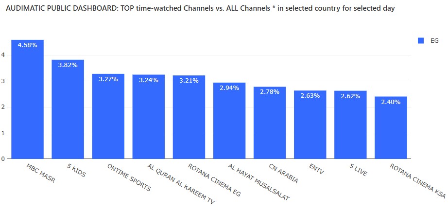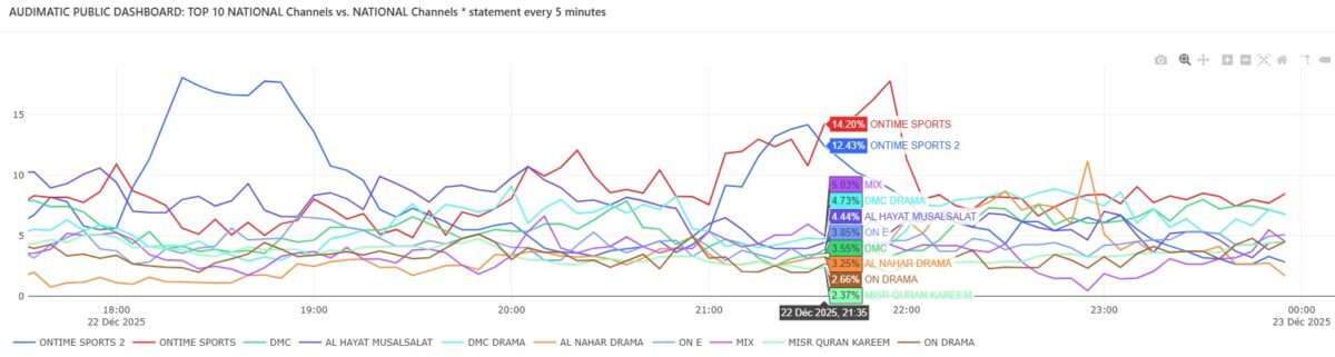 In the moments leading up to kickoff, ENTV was the most-watched channel in Egypt, reaching 17% audience share across all national and international channels. This reflects typical early-evening viewing behavior before live sports take over.