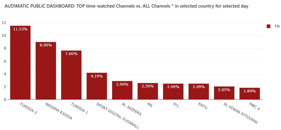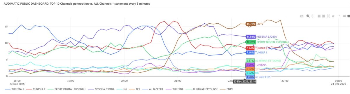 While ENTV maintained a modest audience share of around 1% during daytime viewing, it experienced a sharp rise at the start of the match, reaching 17% audience share among all international channels during live coverage.
