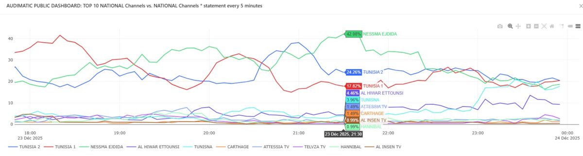 Beyond the result, this match once again highlighted how football structures prime-time viewing habits in Tunisia — with clear shifts in audience concentration before and during kickoff.